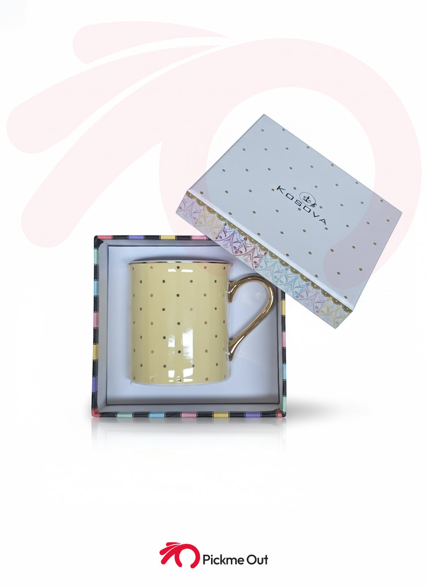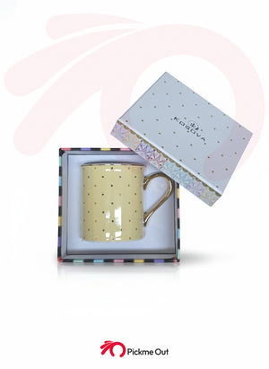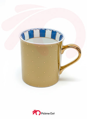 The mug features a soothing cream-yellow glaze adorned with delicate, shimmering gold polka dots that catch the light of your fireplace or Christmas tree. A distinctive royal blue patterned rim adds a pop of contrast, while the gilded handle offers a luxurious grip.