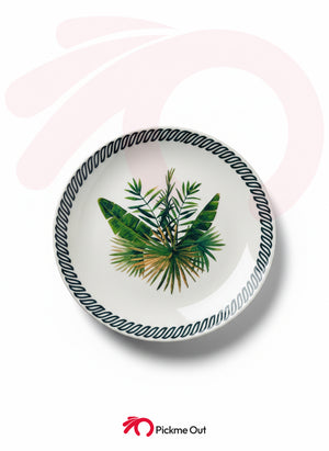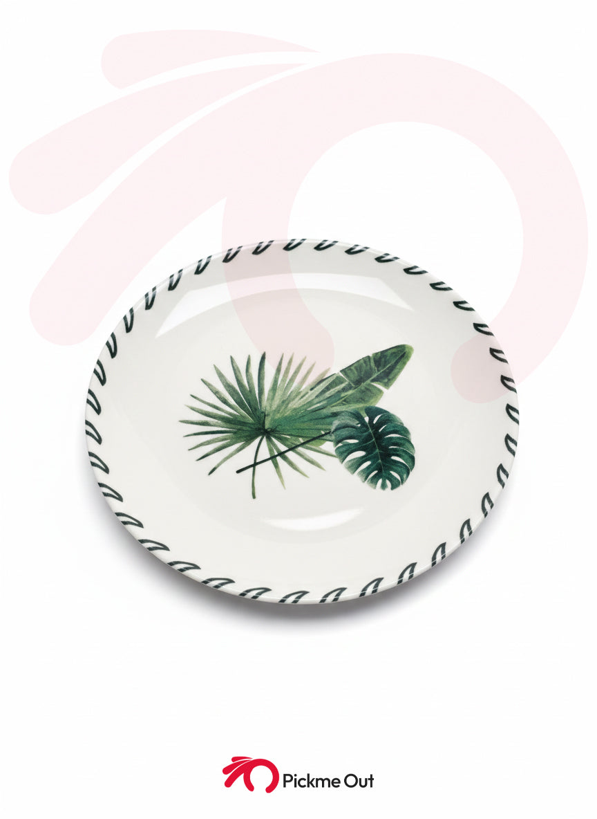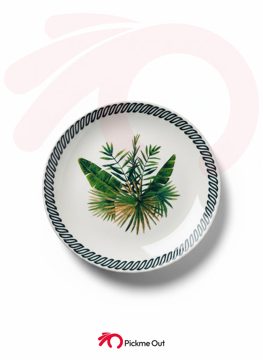 Design: Nature-inspired botanical print with a modern black-patterned rim.