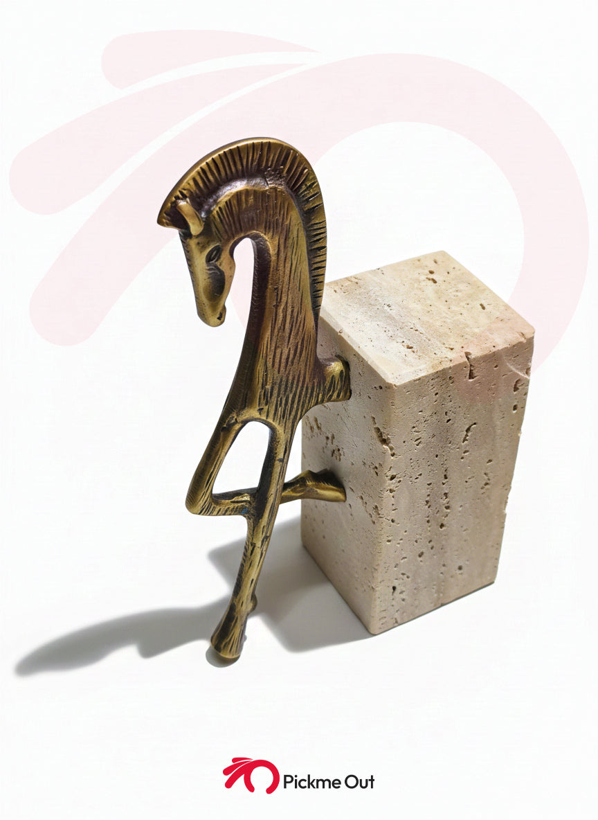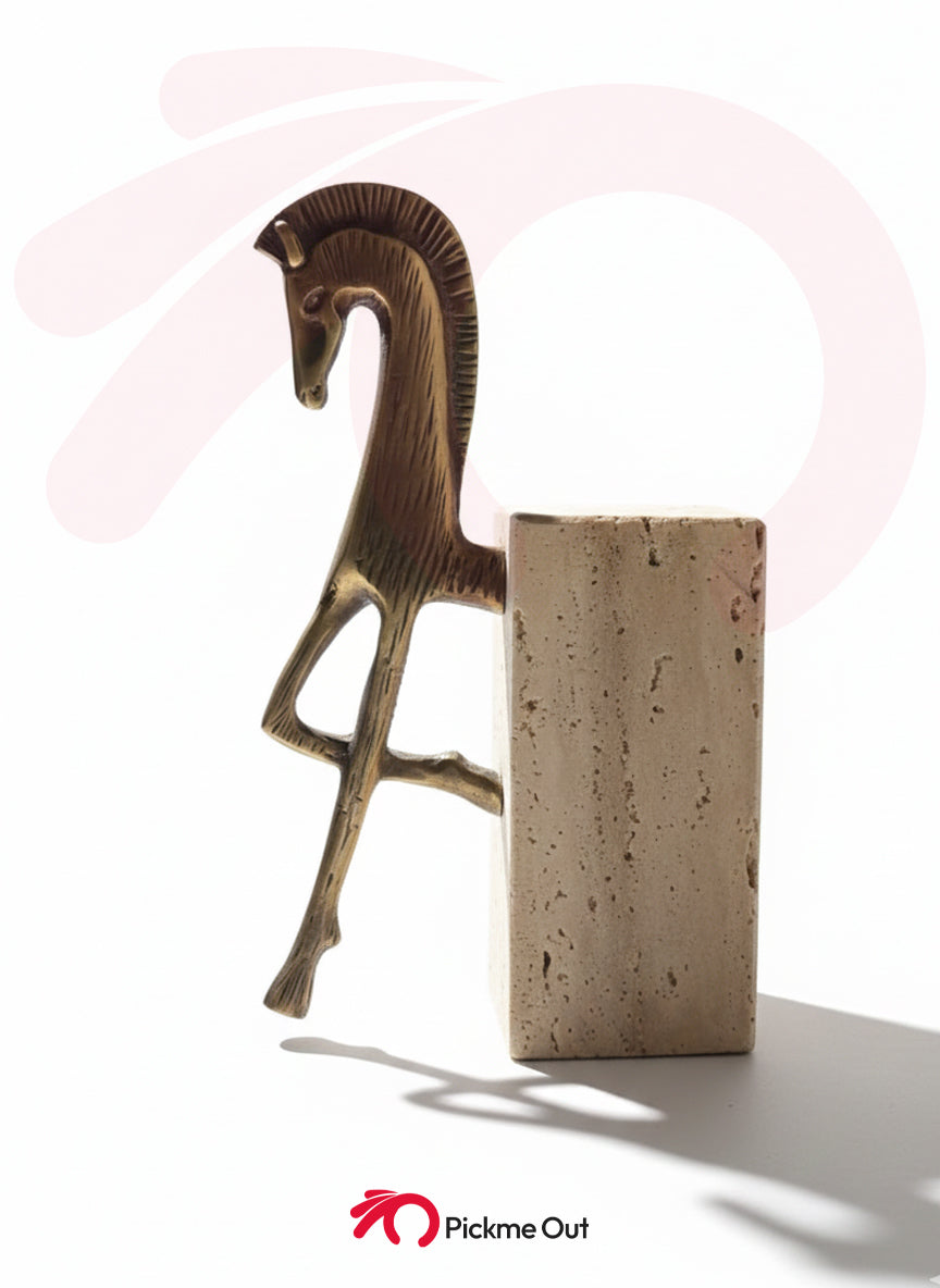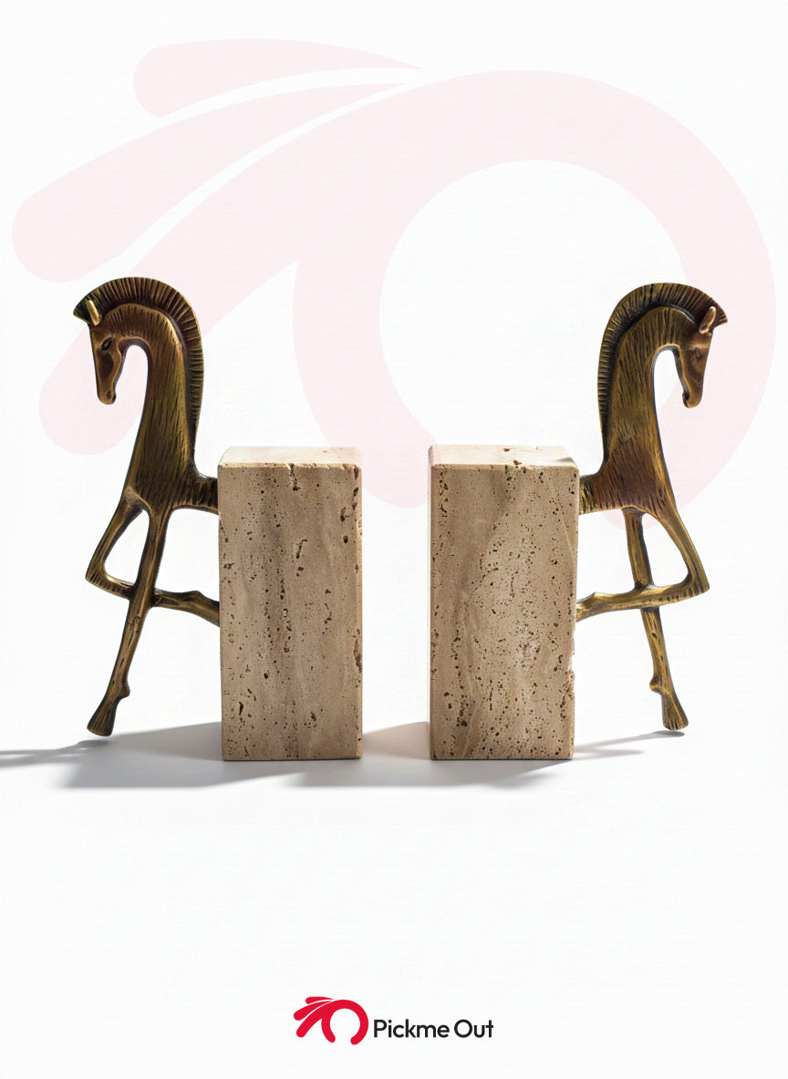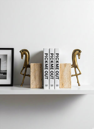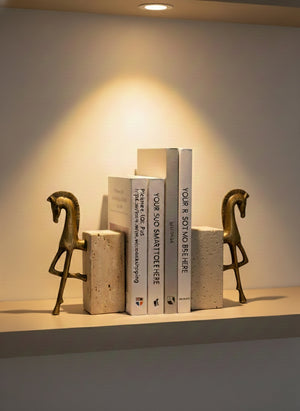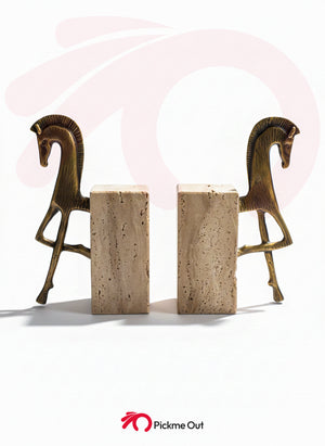 The Aurelian Horse Bookends are a refined blend of classical strength and modern materiality. Sculpted bronze horses stand in poised symmetry, anchored by solid travertine stone blocks that bring natural texture and architectural weight to your space.