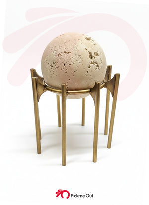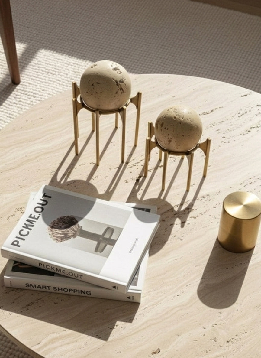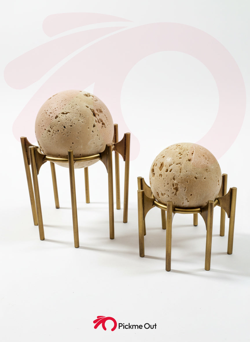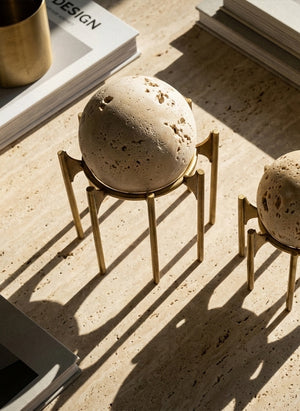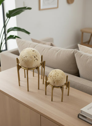 Each sphere is carved from natural travertine, showcasing unique pores, textures, and tonal variations that make every set one of a kind. The warm stone contrasts beautifully with the clean geometry of the bronze base, creating a harmonious blend of organic and modern design.