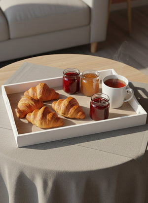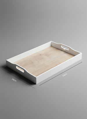 Featuring a clean, crisp white frame and a timeless light wood grain look base, this tray blends seamlessly with modern, Scandinavian, and minimalist decor. The cutout handles on both sides are integrated into the design, making lifting and carrying both comfortable and secure.