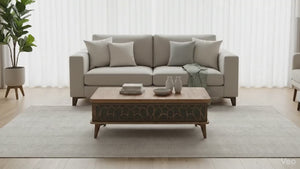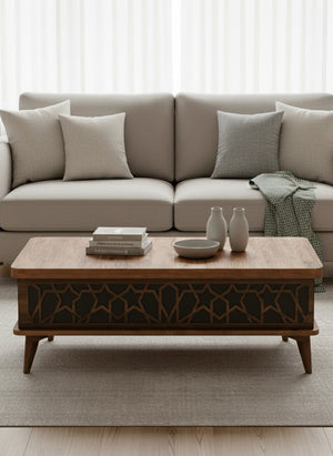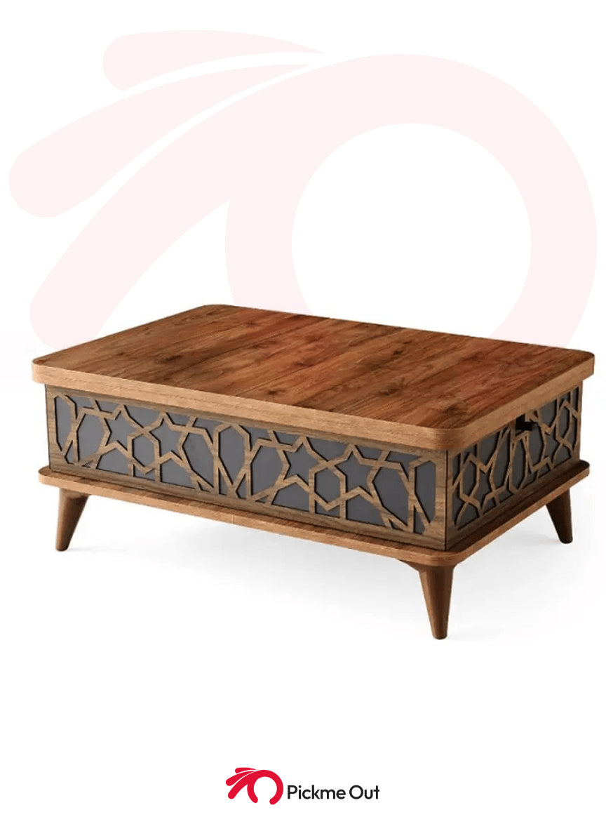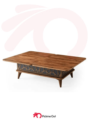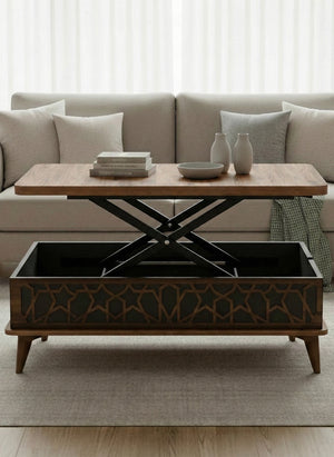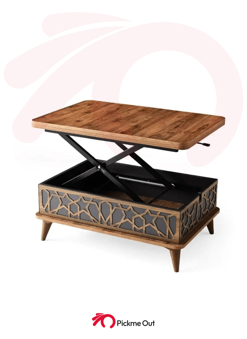 A classic coffee table with an extendable top and a rise-up table mechanism that can turn the table into multi-functional for all purposes, in grey and natural color.