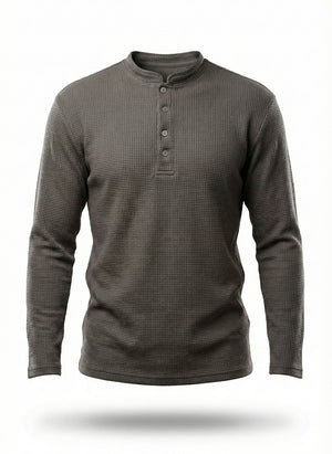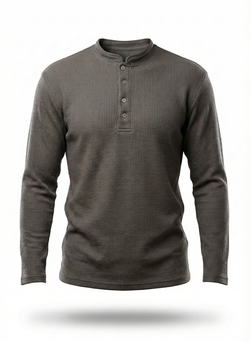 • Long-sleeve Henley top with button placket