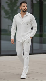 The long-sleeve button-up top features a sleek minimalist collar and a Prada triangular logo on the left chest, offering a subtle yet unmistakable designer statement. The matching trousers deliver a streamlined, athletic fit with a second Prada logo placed on the left leg, creating perfect balance and brand continuity.