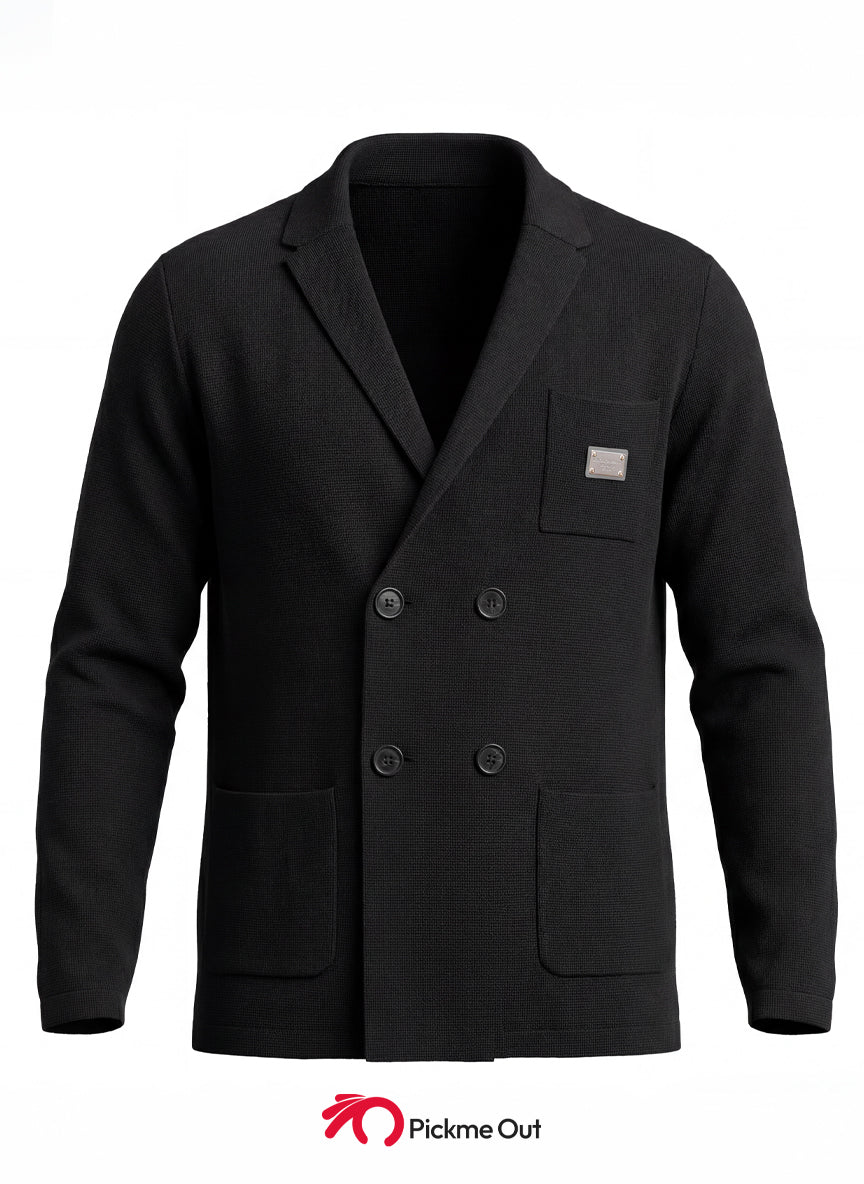 Designed for both style and practicality, the jacket features functional front patch pockets and a subtle branded metal plaque on the chest pocket, delivering understated luxury. Its textured knit construction provides warmth and flexibility, making it ideal for transitional seasons or elevated casual wear.