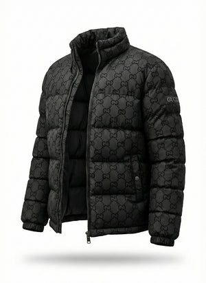 The jacket features a sleek quilted construction with a lightweight insulated interior, offering warmth without compromising on silhouette. Its signature all-over Gucci pattern adds subtle prestige, while the structured fit enhances the shoulders and chest for a confident, masculine look.